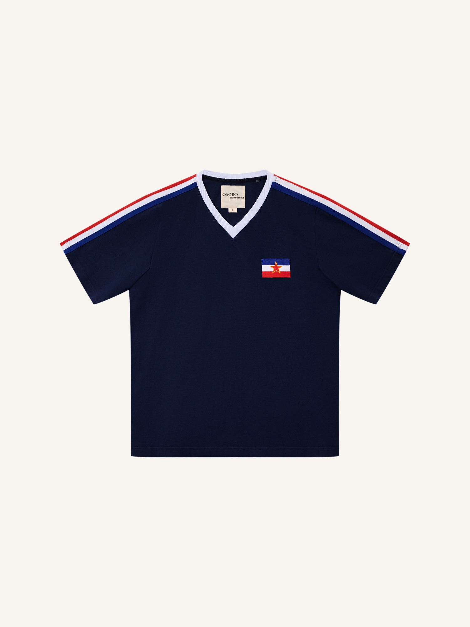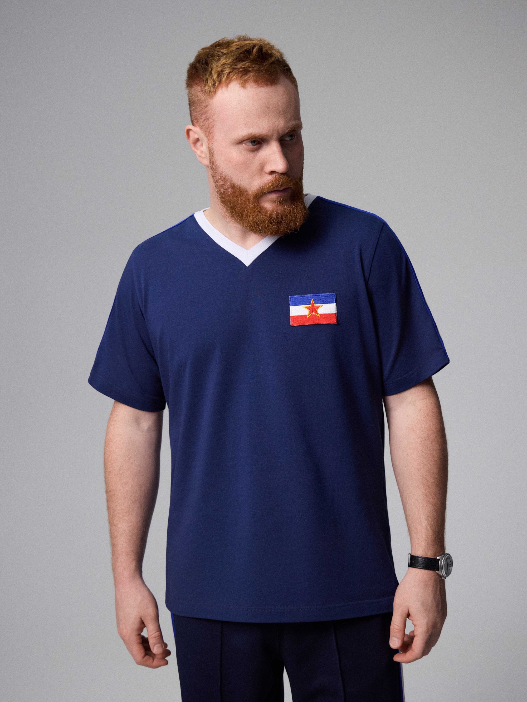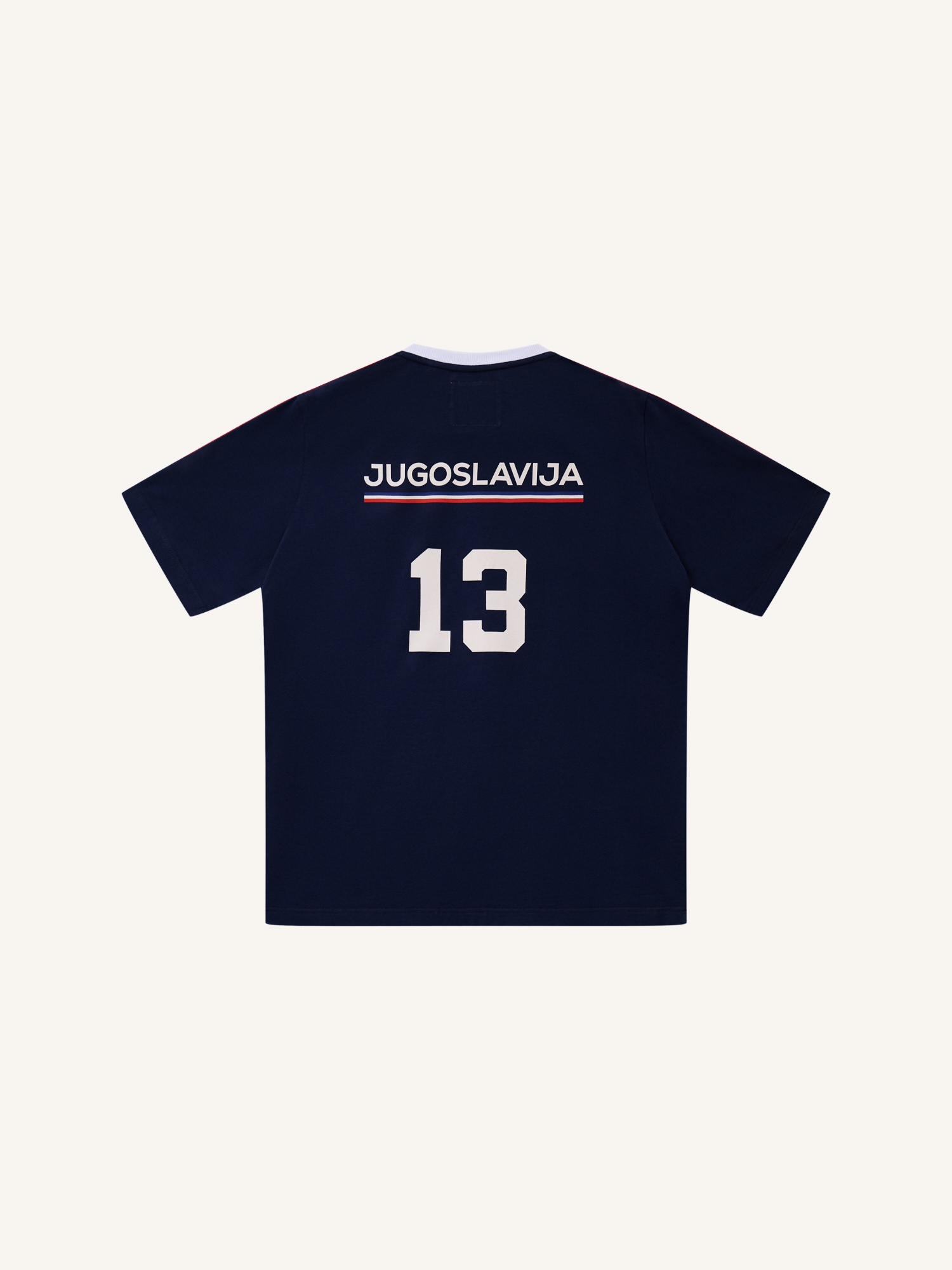 Футболка JUGOSLAVIJA создана по мотивам классической футбольной формы второй половины XX века и является частью капсулы, выпущенной в коллаборации со стендап-комиком Евгением Чебатковым. Коллекция обращается к спортивному наследию Югославии, вдохновляясь историей страны, её эстетикой и олимпийской формой той эпохи. Архивные мотивы, узнаваемые силуэты и дух большого спорта переосмыслены здесь в современном ключе — смело, иронично и стильно.