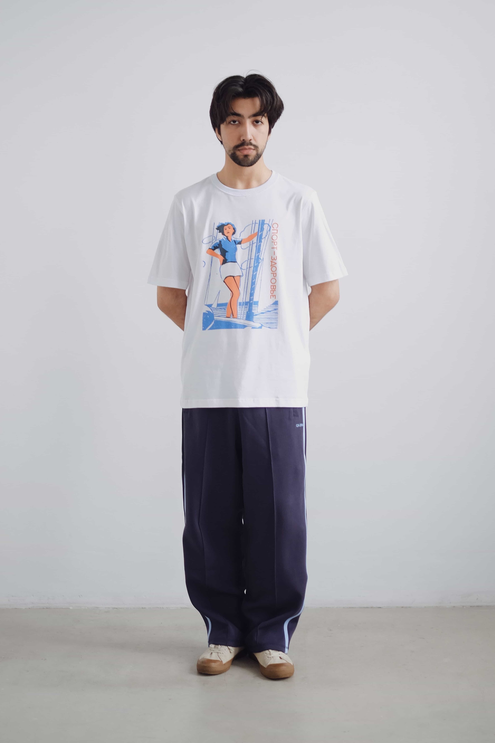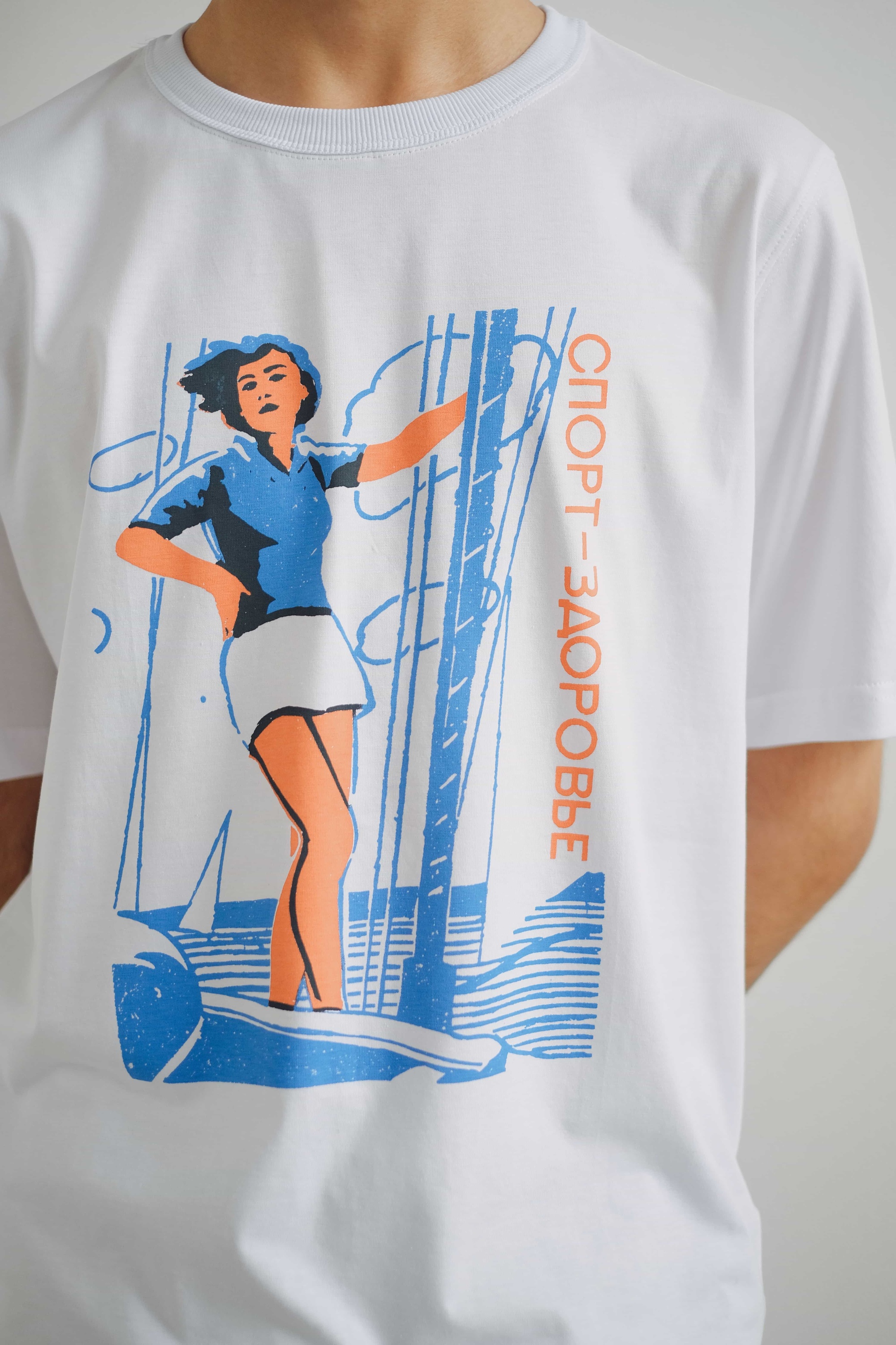 Центральным акцентом изделия выступает яркий, крупный, шелкографический принт, выполненный в стилистике советской плакатной графики. Иллюстрация изображает девушку на палубе яхты и сопровождается лозунгом «СПОРТ — ЗДОРОВЬЕ».