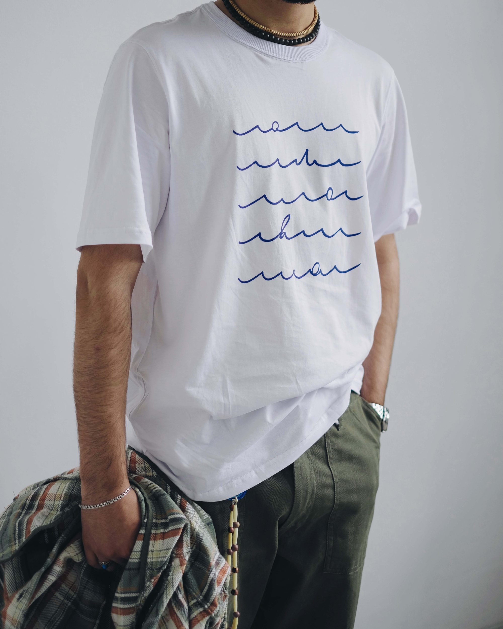 Принт на груди выполнен водными красками в технике лайна. Плавные синие линии складываются в морскую рябь, создают графическую композицию с эффектом ручной каллиграфии.