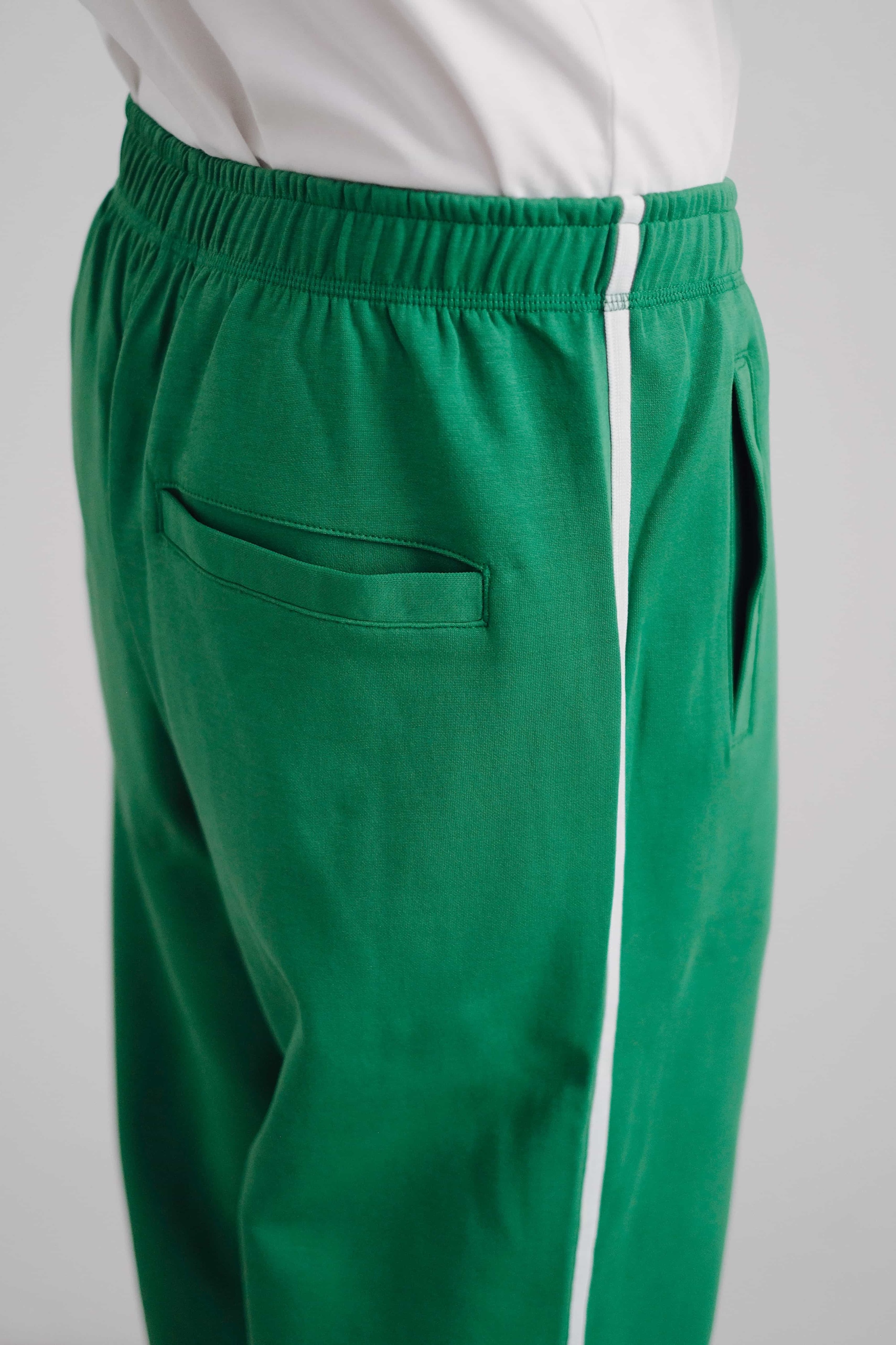 Брюки свободного кроя гарантируют комфорт и свободу движения. Яркая деталь - контрастные лампасы, отсылающие к эпохе великих спортивных достижений.  Брюки выполнены из эластичной мягкой хлопковой ткани.