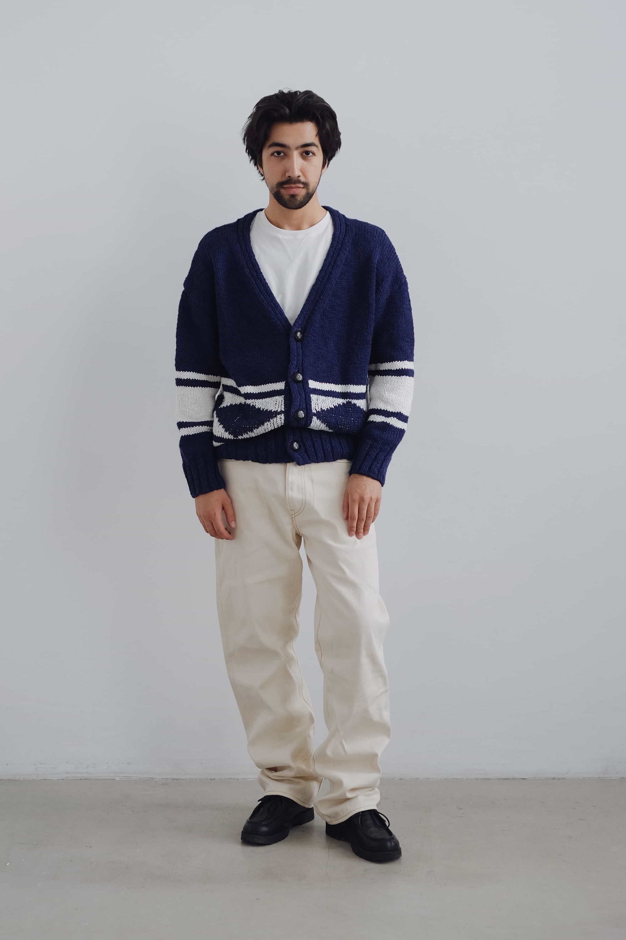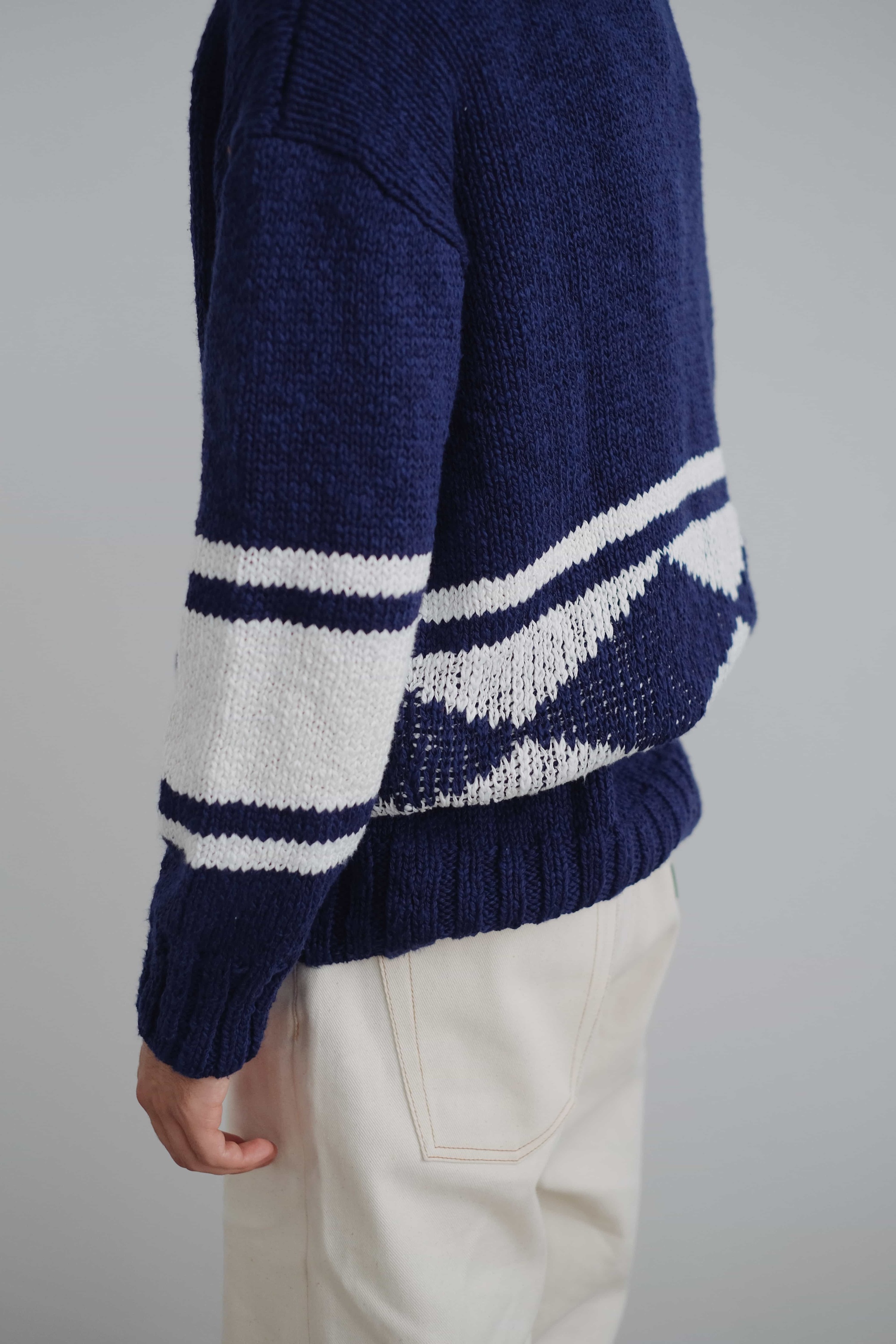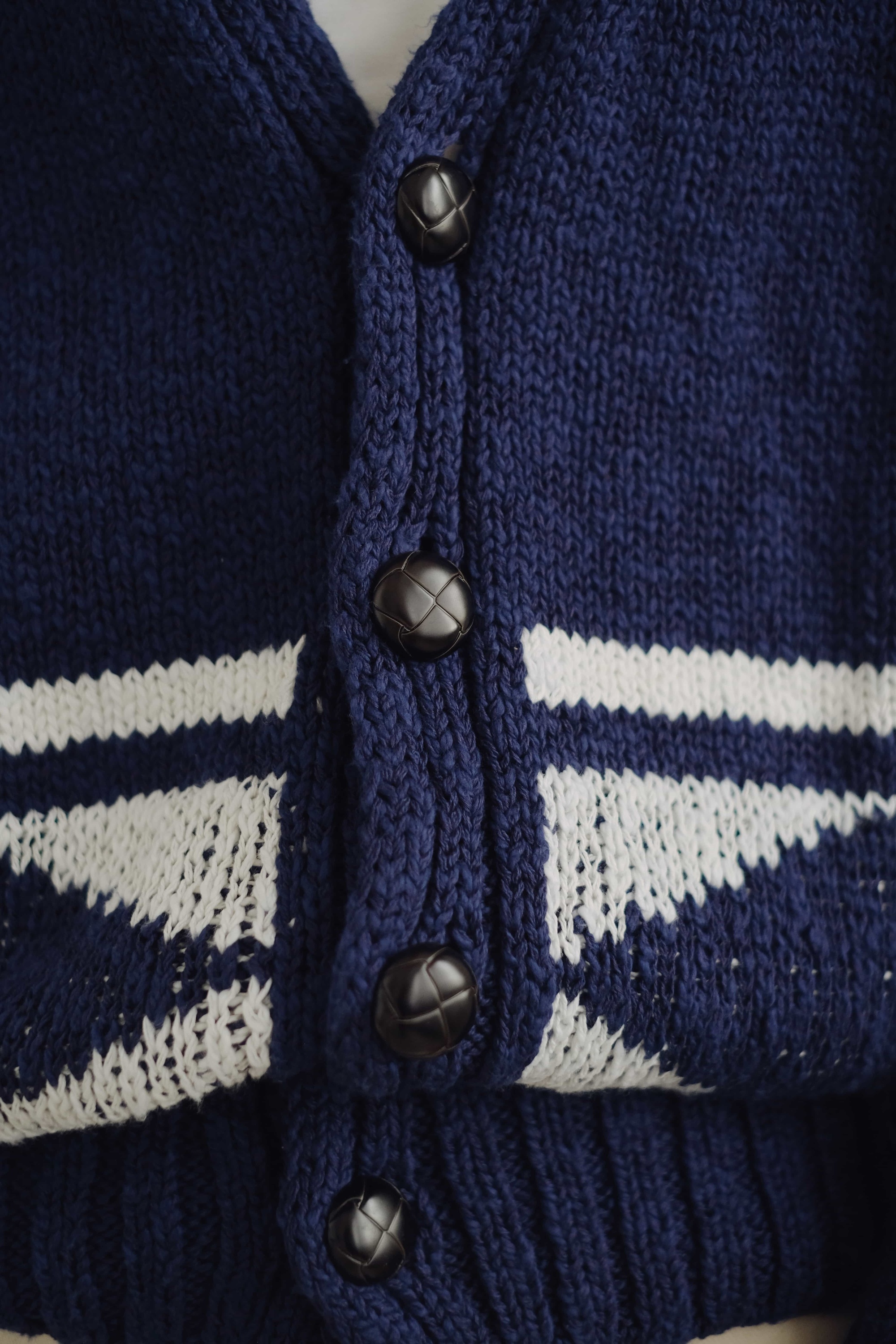 Темно-синий кардиган силуэта oversize с цветным жаккардовым узором вдохновлен формой, в которой выступал легендарный хоккеист, центральный нападающий сборной СССР, Игорь Ларионов, носивший номер "8". На груди и рукавах - шевроны с узнаваемой атрибутикой. Модель ОЛОВО наследует характерный рисунок "в ромбик", который впервые появился на свитерах советских хоккеистов в 1980 году на Зимних Олимпийских играх в Лейк-Плэсиде. Модель выполнена из смесовой хлопковой пряжи с добавление акриловых волокон, которые придают материалу прочность. За счет структурной нити с утолщениями и крупной вязки кардиган получился фактурным.