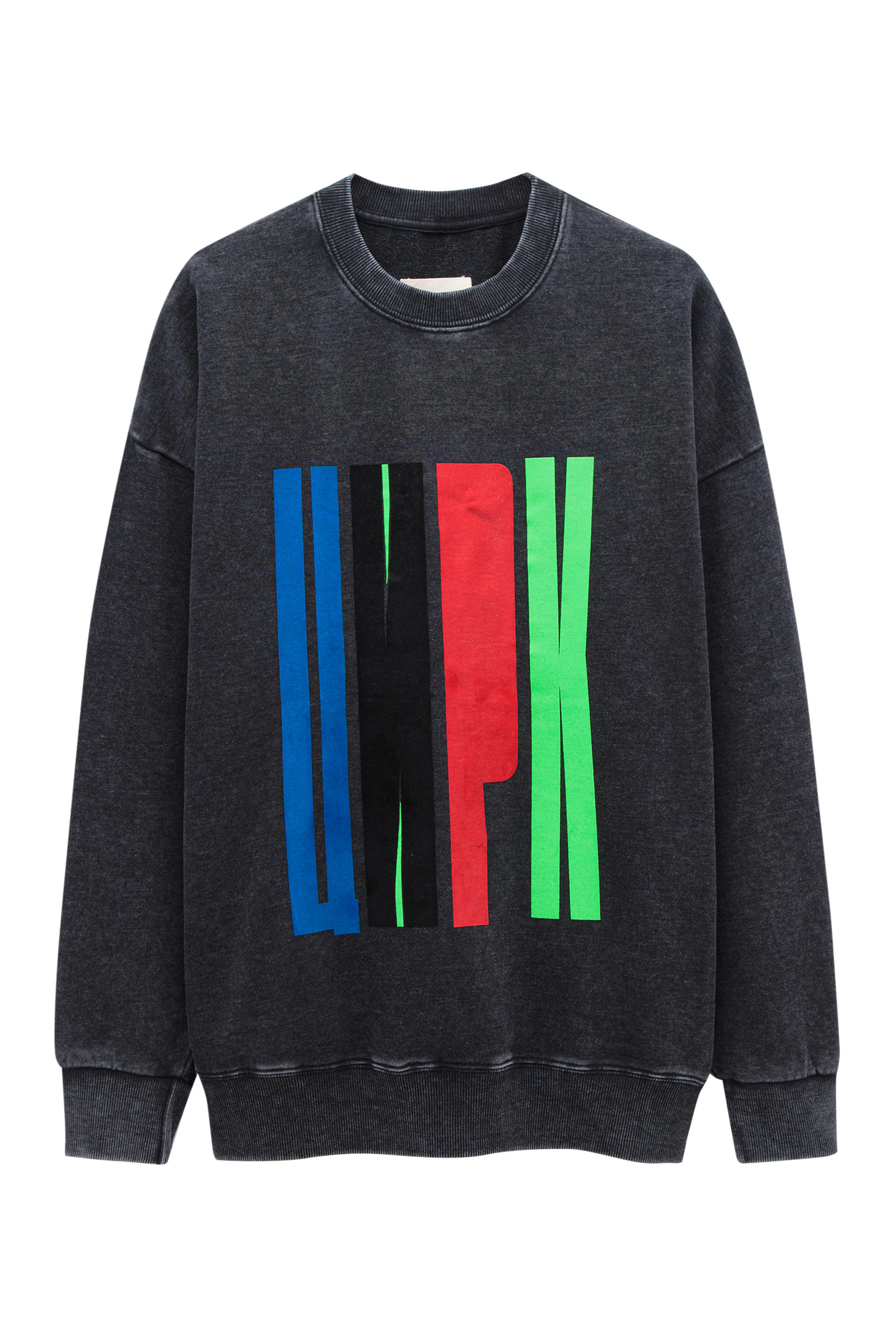 Черный свитшот из натурального хлопка. Окрашен по технологии Garment Dye. Объёмная модель с рельефными швами, рукава с манжетами и круглый ворот с отделкой в рубчик. Изделие декорированно принтом в технике флок.