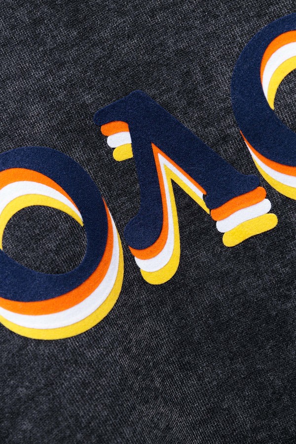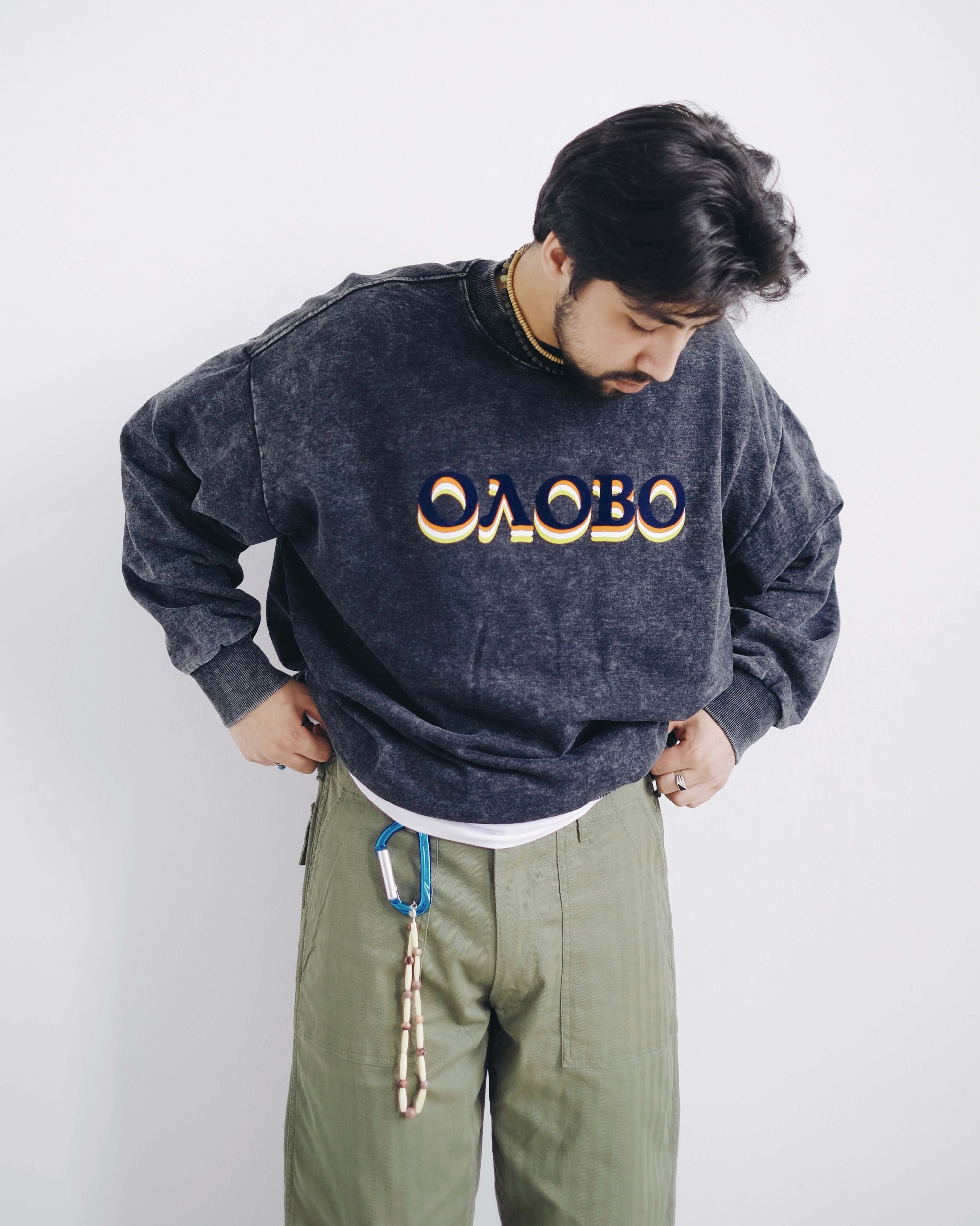Центральным акцентом свитшота выступает флок-принт с матовой, бархатистой поверхностью. Логотип «ОЛОВО» стилизован в духе ретро-эстетики и оформлен в насыщенной палитре тёмно-синего, жёлтого, белого, оранжевого цветов. Это отсылает к визуальному стилю советского дизайна и винтажных спортивных логотипов.