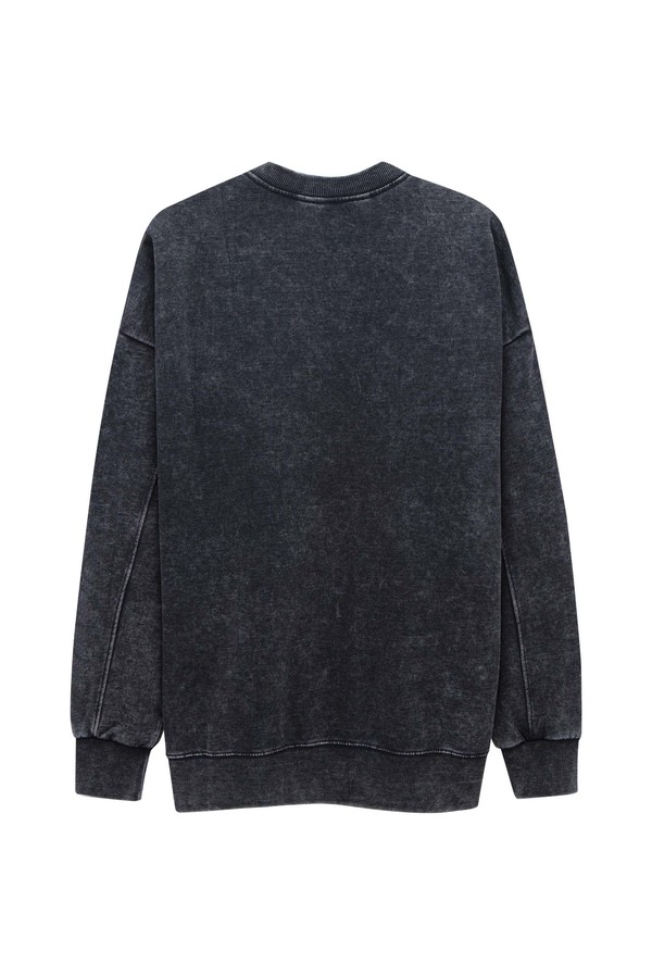 Свитшот свободной посадки выполнен из хлопкового трикотажа. Изделие окрашено по технологии Garment Dye, благодаря чему достигается мягкость полотна и благородный тёмно-графитовый оттенок с эффектом варки. Классический круглый ворот, манжеты и пояс выполнены из трикотажного полотна в рубчик.