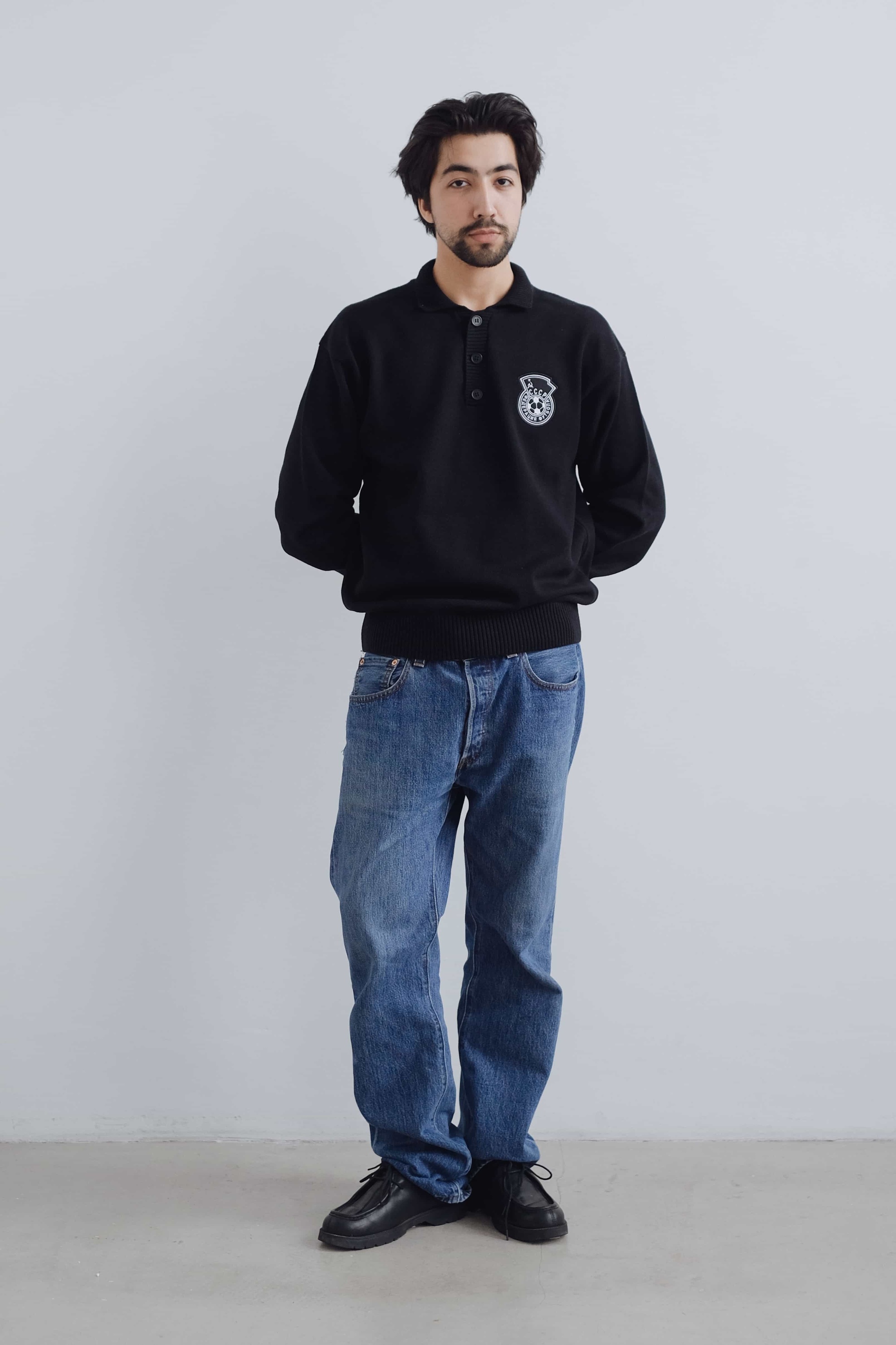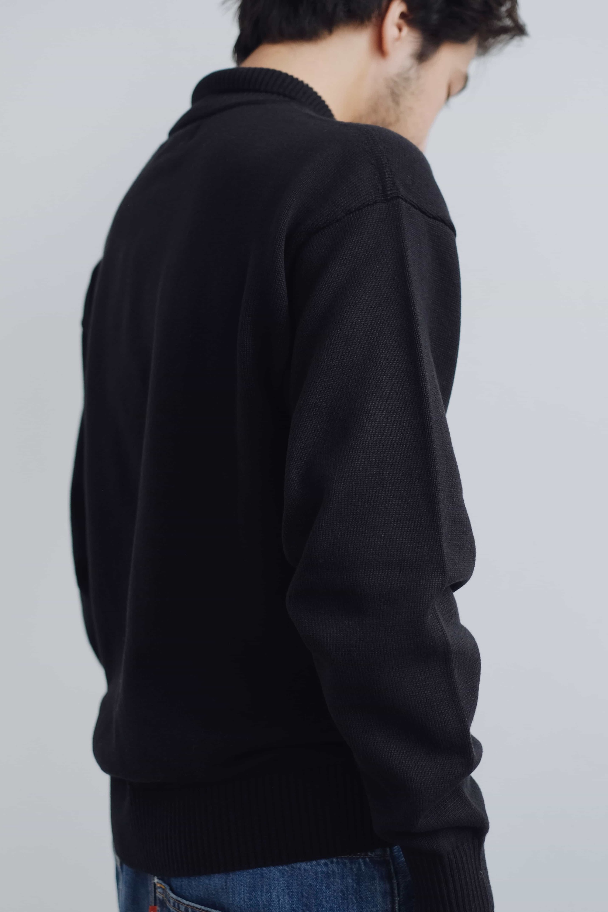 Свитер с длинными рукавами выполнен из хлопковой пряжи. Воротник поло застегивается на пуговицы. Манжеты, пояс, воротник, планка - в рубчик.