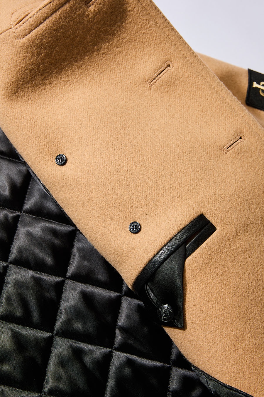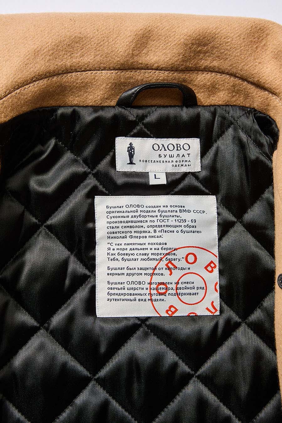Стойка воротника и внутренние карманы выполнены из натуральной кожи. На рукаве шеврон «Ф» - это деталь с погона матроса, обозначающая «флот». В дизайне пуговиц использованы элементы исторических образцов с формы ВМФ.