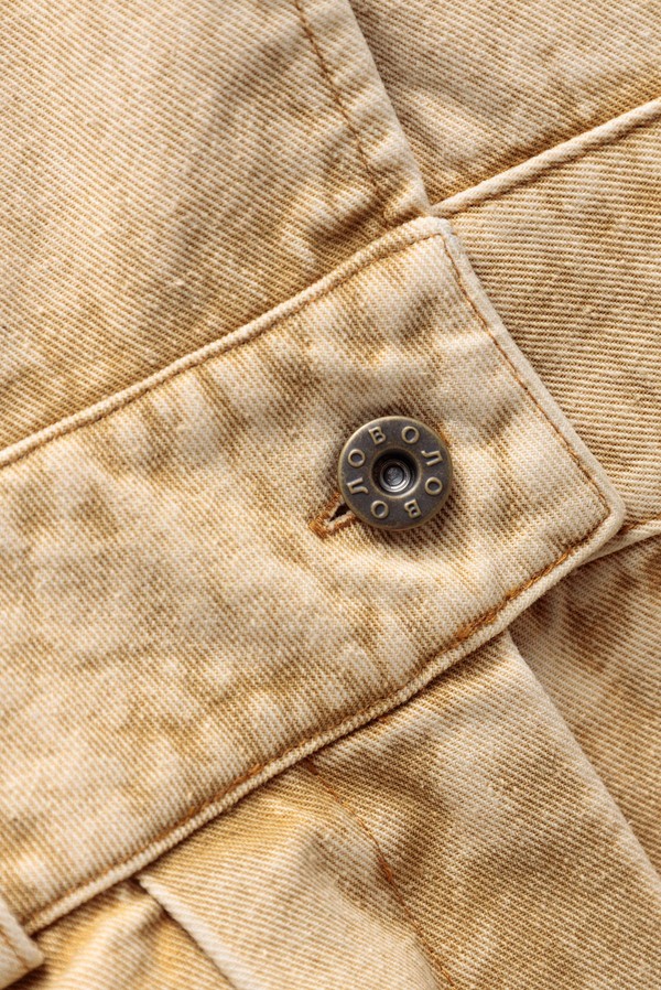 нагрудные карманы с клапанами, декоративные погоны на плечах, пояс со шлевками для ремня, а также характерная плотная ткань с саржевым переплетением.