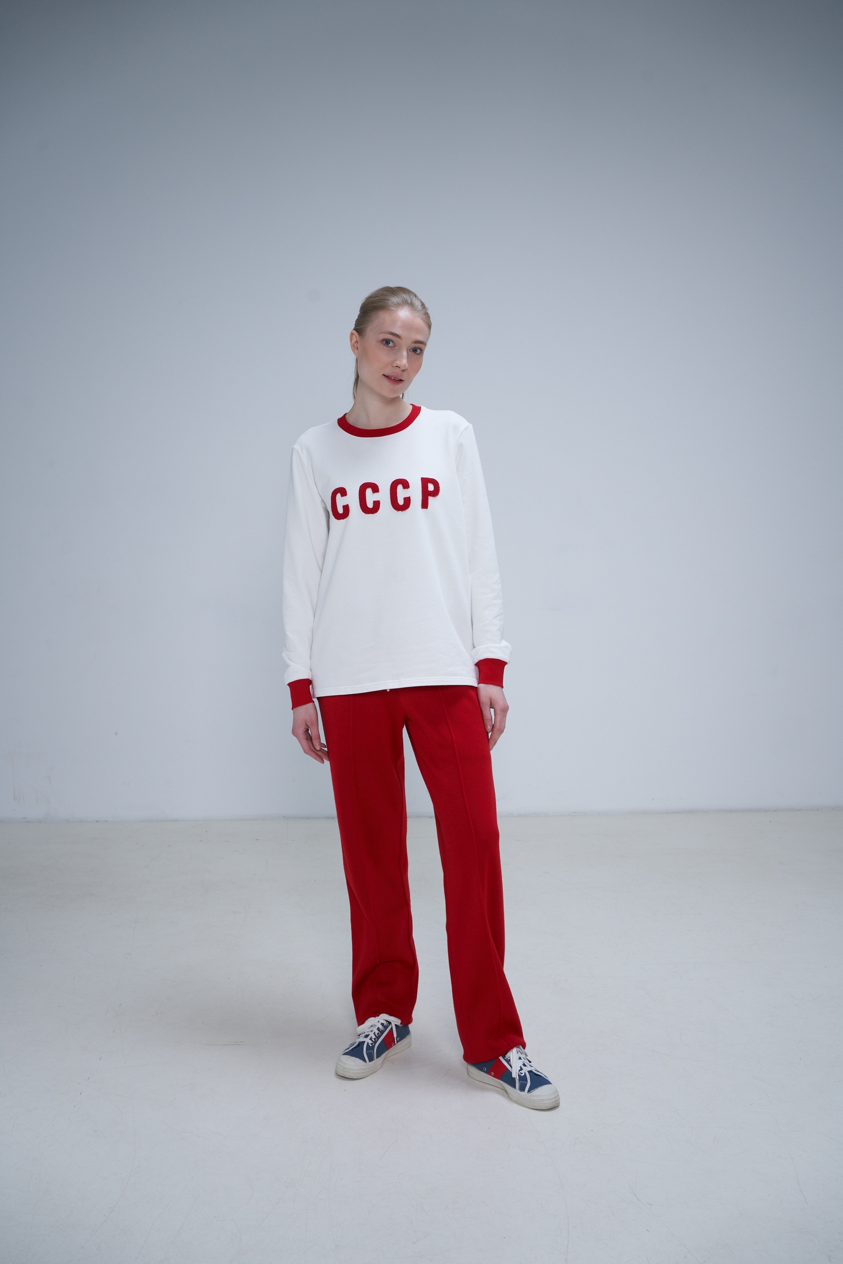 This long sleeve T-shirt is based on the original game uniform of the USSR national soccer team of the 1970s: Soviet soccer players wore these jerseys to defend their country's honor at the World Cup in Mexico. The white T-shirt with contrasting red collar and cuffs is made of thick cotton fabric - double-threaded futer, smooth outside and soft inside.